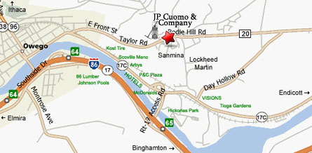 Ithaca: Take Route 96B South to Candor and then Route 96 South to Owego. Once in Village of Owego stay on Route 96 South to Route 17C in downtown Owego. Take 17C East (Front Street) and turn LEFT at the Century 21 office (E. Front St. - you will immediately go over railroad tracks). Stay on this road and JP Cuomo & Company will be on your left across from Sanmina Corporation.